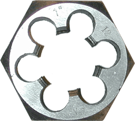 Dies thread the outer diameter of a rod. Hex shaped dies can be driven by a large hand wrench or socket, or a hex die wrench.