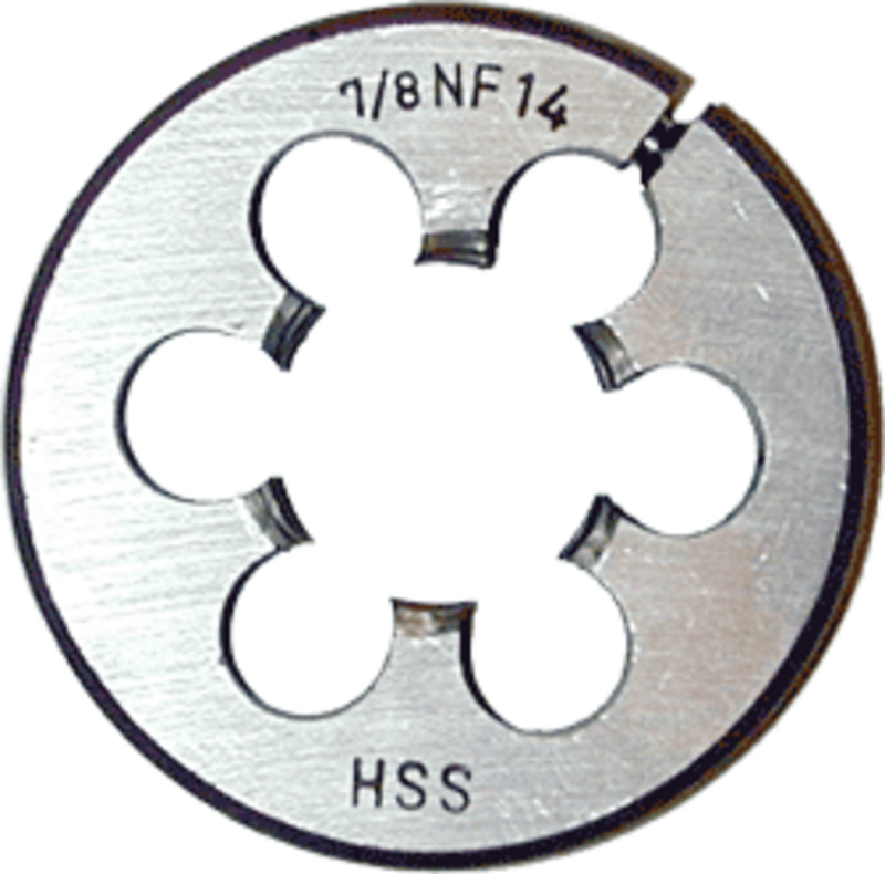 Dies thread the outer diameter of a rod. Round dies are driven by a round die wrench.